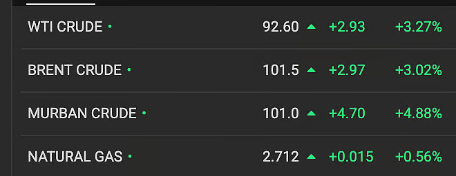 Meanwhile, Murban crude — a key Middle Eastern benchmark closely watched by Asian buyers — posted the strongest gain among the major grades, rising $4.70, or 4.88%, to $101.