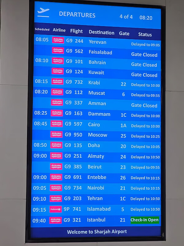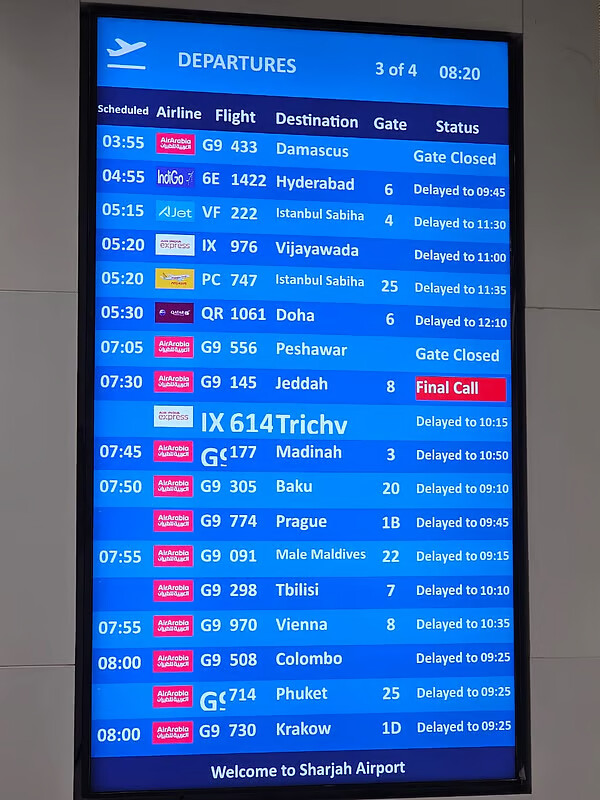 Eyewitnesses at Sharjah Airport reported at least 28 flights were delayed due to the dense fog, primarily affecting Air Arabia flights, with some routes rescheduled by Indigo and Air India Express among other international carriers.