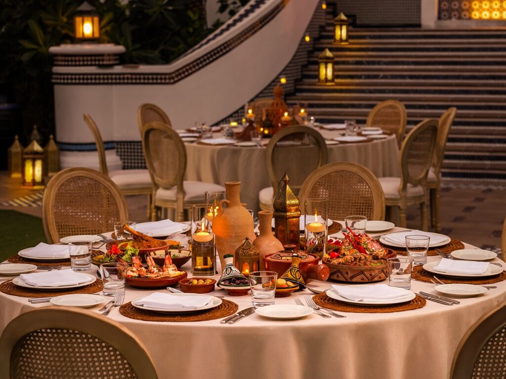 It’s like breaking your fast in a vibrant, verdant garden. Terracotta and soft beige tones set the scene, while flowing drapes and light fabrics sway gently in the breeze.