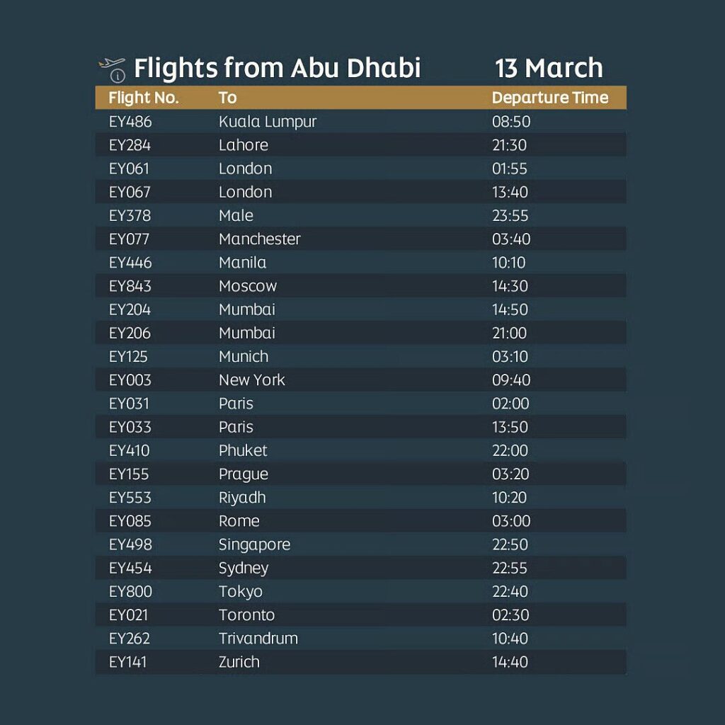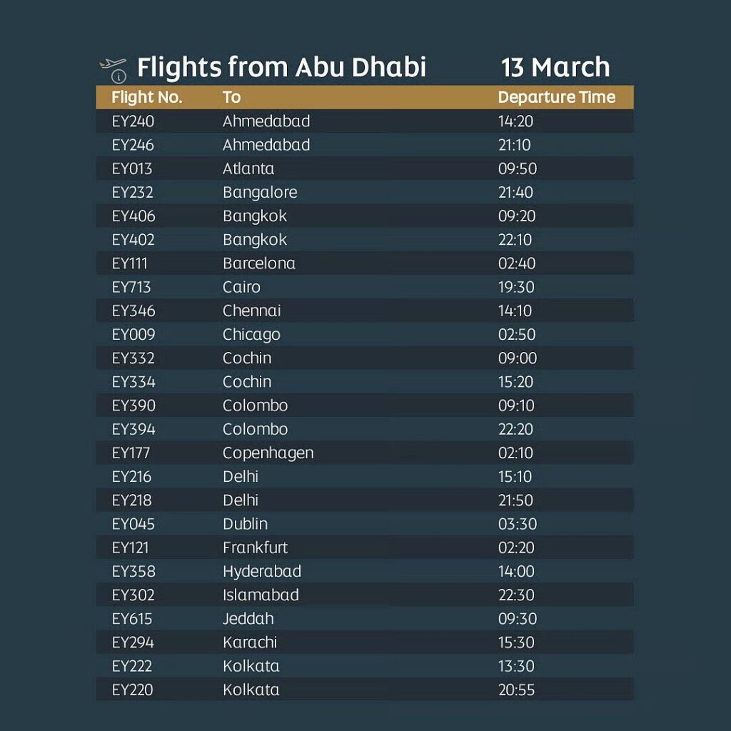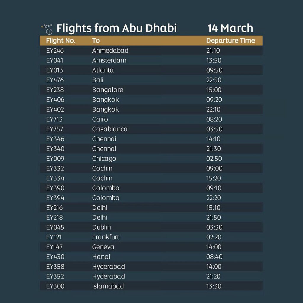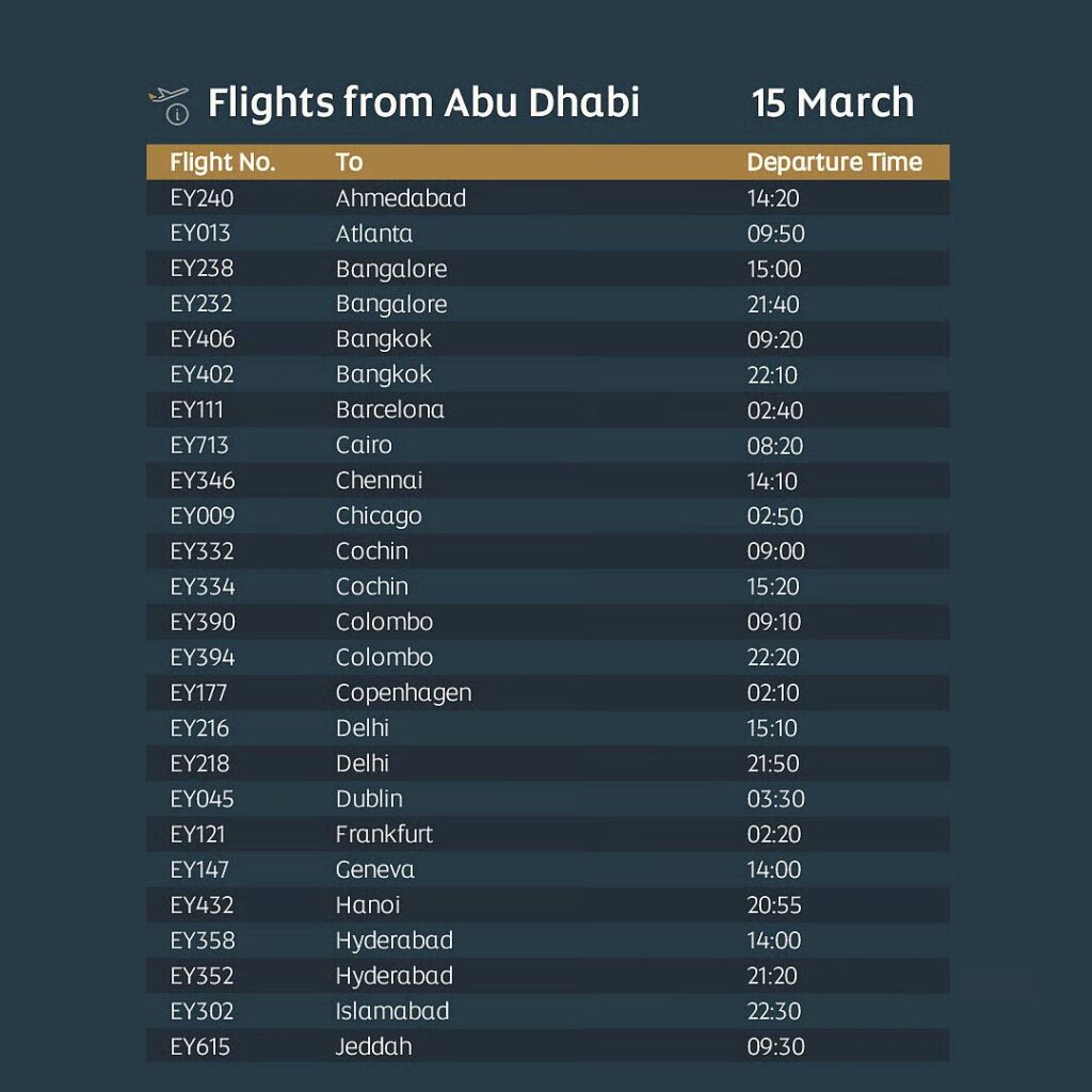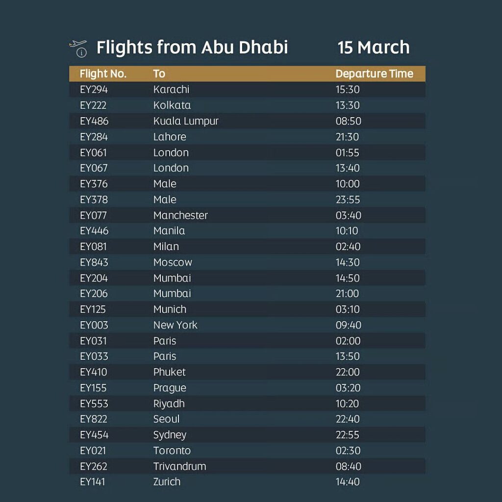 • Flights on March 15 will run subject to safety checks; passengers should rely on Etihad’s official updates.