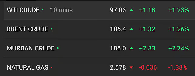 US crude benchmark WTI rose 1.23% to $97.03 a barrel in early trading, while Brent crude, the international benchmark, climbed 1.26% to $106.4 a barrel.