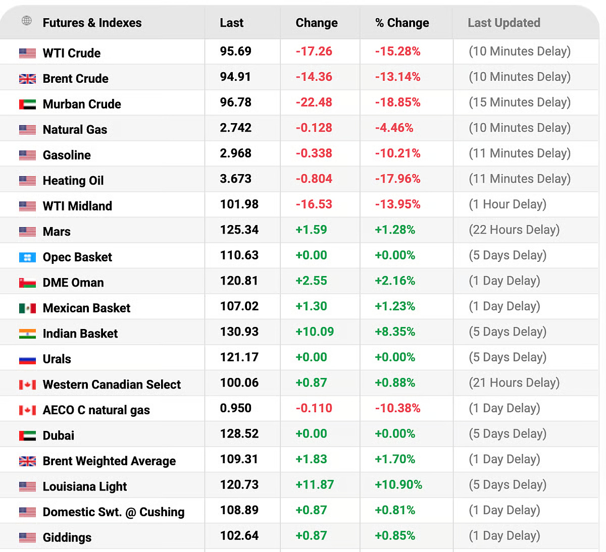 Heating oil plunged 17.96% and gasoline futures fell 10.21%, reflecting expectations that restored supply flows would weaken fuel prices. Natural gas also eased about 4.46%. Other regional crude grades showed mixed moves amid ongoing market volatility.