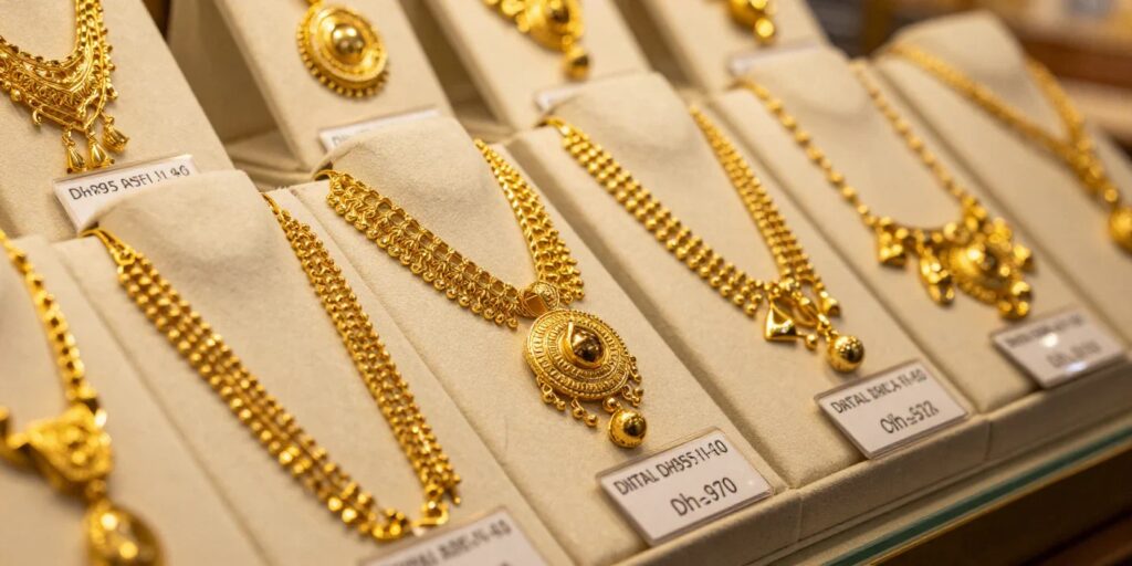 At 9:27 am, 24-karat gold was priced at Dh599.75 per gram, down from Dh607.50 on Sunday, while 22-karat gold fell to Dh555.25 from Dh562.50, continuing a retreat in line with international trends.