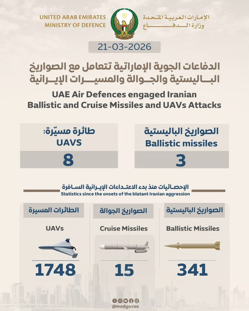 Since the beginning of these Iranian attacks, UAE air defences have engaged a total of 341 ballistic missiles, 15 cruise missiles, and 1,748 UAVs.