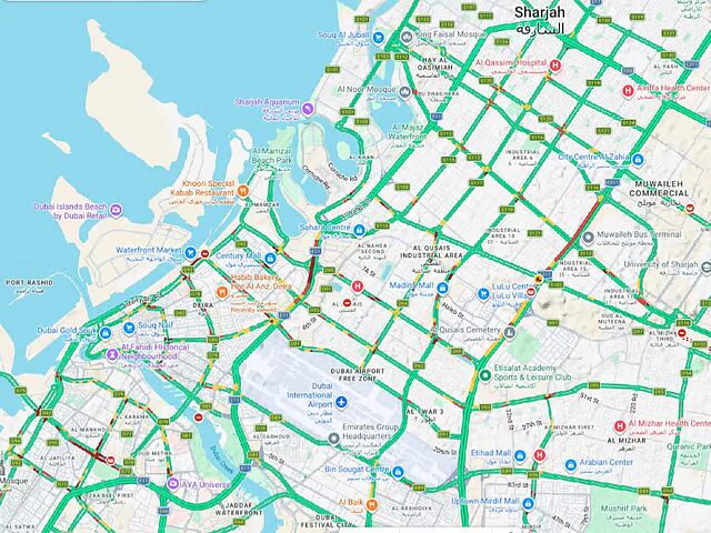Morning rush-hour traffic is gradually building across key routes in Sharjah and Dubai, according to Google Maps live data.