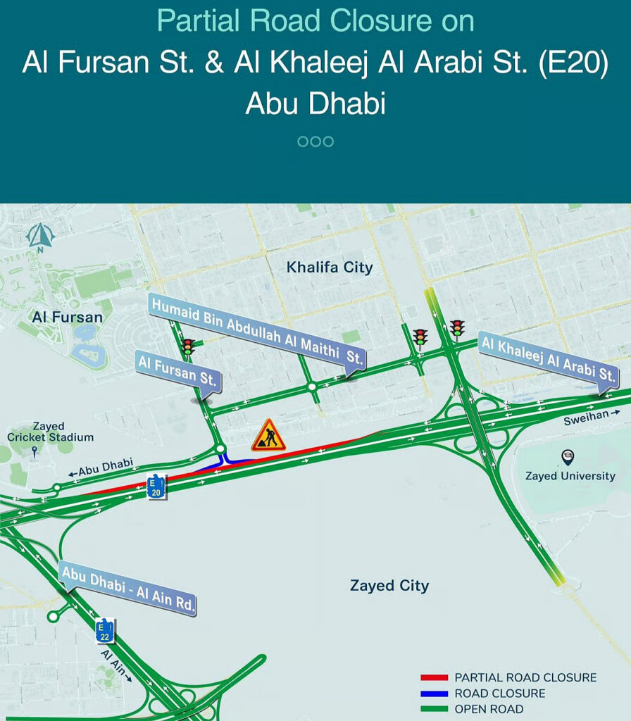 Separately, AD Mobility has announced a partial road closure at the intersection of Al Fursan Street and Al Khaleej Al Arabi Street (E20) due to ongoing infrastructure and maintenance works.