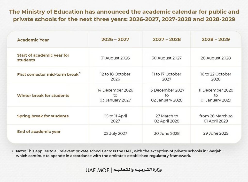 Private schools in Sharjah are exempt from this arrangement and will continue to follow the emirate’s existing regulatory framework. Families in Sharjah are advised to confirm holiday dates directly with their schools, as schedules may vary.
